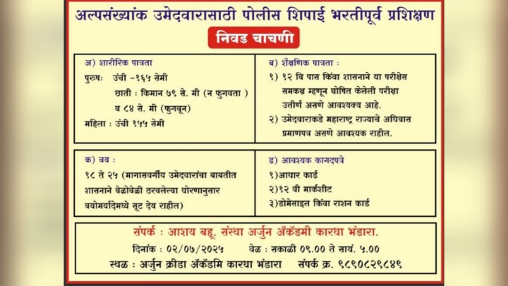 भंडारा : अल्पसंख्यांक समाजातील उमेदवारांसाठी पोलीस शिपाई भरतीपूर्व प्रशिक्षण निवड चाचणीचे आयोजन आशय बहुउद्देशीय संस्थेच्या वतीने करण्यात आले आहे. या चाचणीसाठी इच्छुक उमेदवारांनी २ जुलै २०२५ रोजी उपस्थित राहावे, असे आवाहन संस्थेने केले आहे. मुस्लिम, जैन, बौद्ध आणि पारशी समाजातील निवड झालेल्या उमेदवारांना पोलीस भरतीपूर्व प्रशिक्षण दिले जाणार आहे.